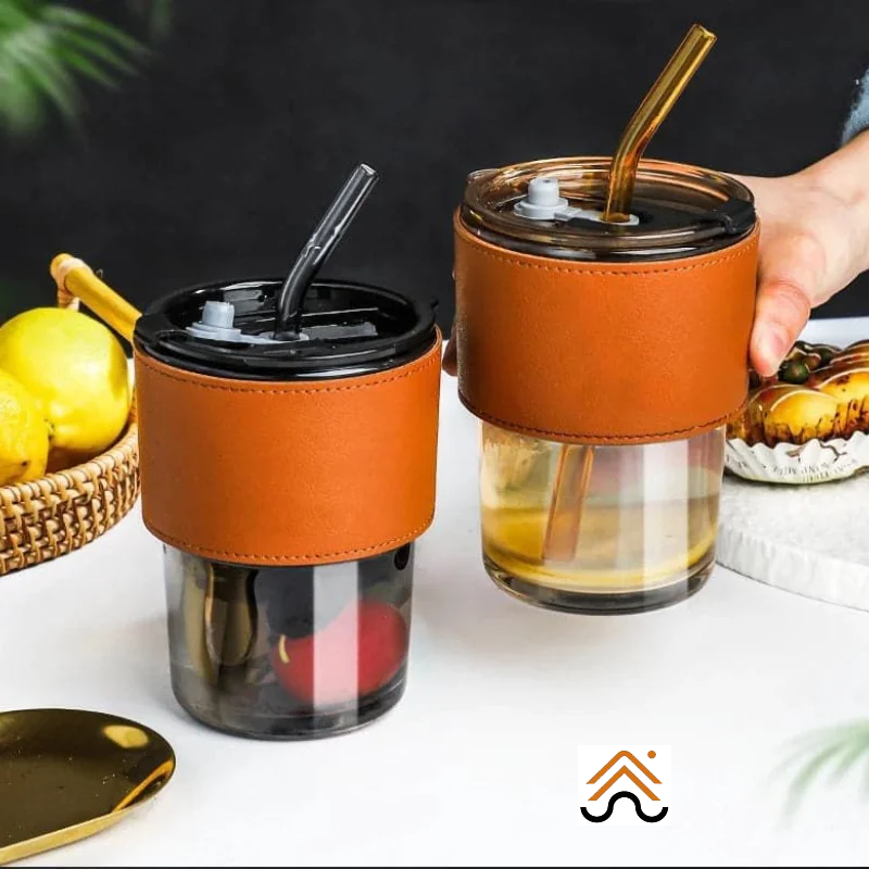 Material: Cup: High borosilicate glass, Lid: Natural bamboo, Straw: Glass,Sleeve: Leather